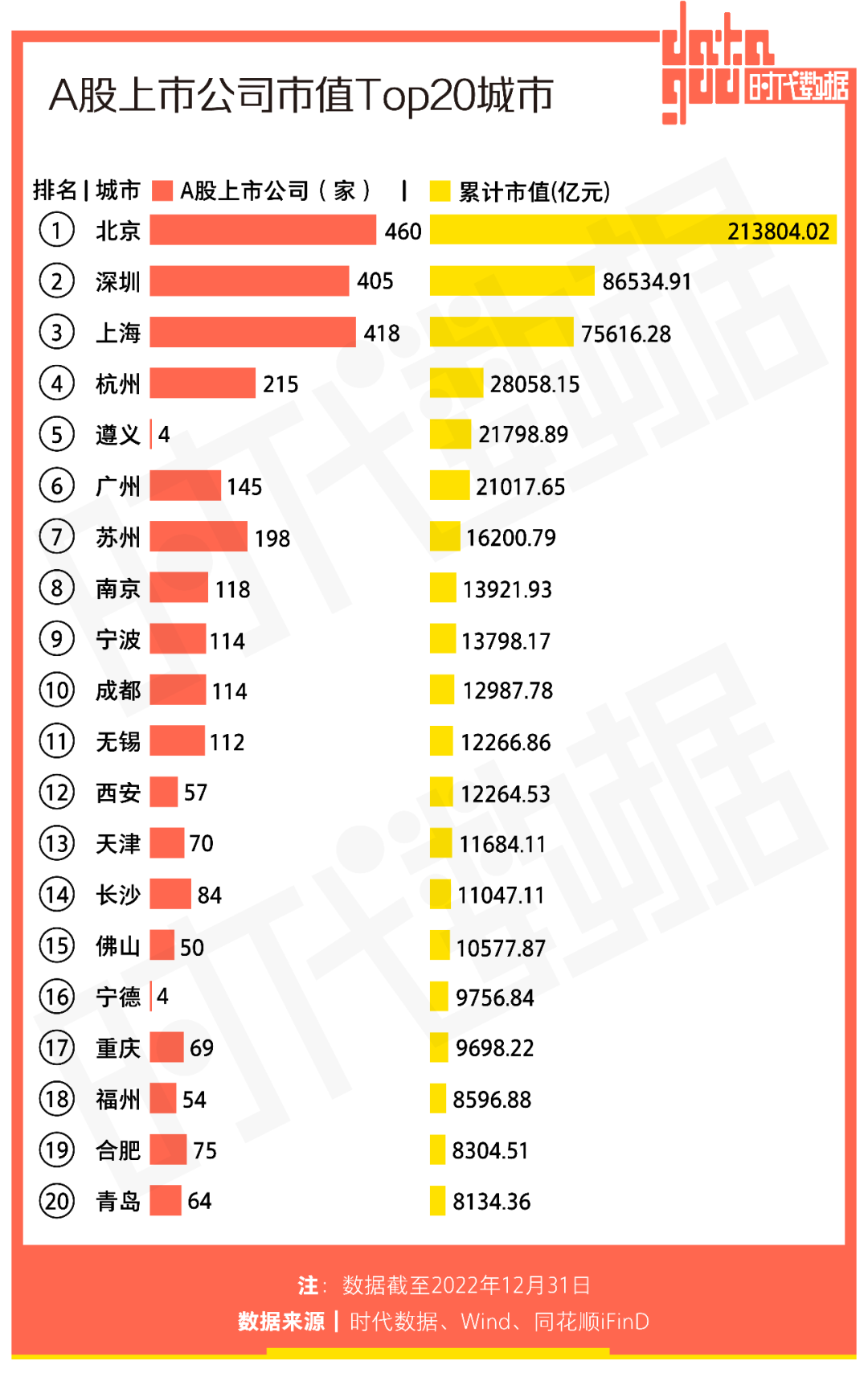 据时代数据统计,截至2022年12月31日,A股5067家上市公司总市值达到87.75万亿元。其中,北京460家上市公司累计市值达到21.38万亿元,高居第一;深圳405家上市公司累计市值达到8.65万亿元,位居第二;上海418家上市公司累计市值达到7.56万亿元,位居第三。