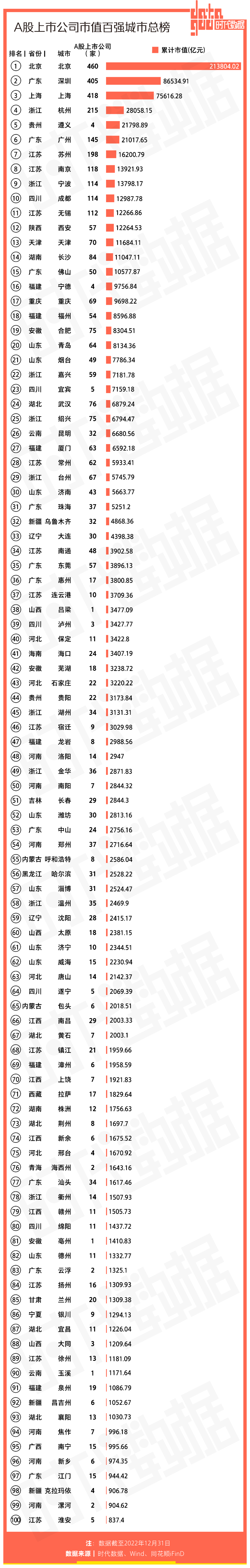 据时代数据统计,A股市值百强城市的累计市值达到82.9万亿元,占A股2022年末总市值的94.47%,超过九成。同时,2022年A股市值百强城市的入围门槛为837.4亿元。