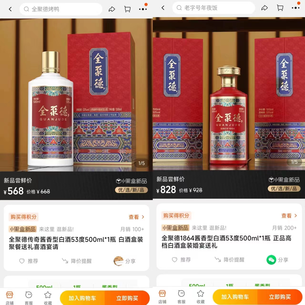 时代周报记者在浏览淘宝全聚德旗舰店后发现,“全聚德·1864”和“全聚德·传奇”,均为53度酱香型白酒,每瓶500ml的售价分别为828元和568元。目前“全聚德·1864”的销量更好,但月销也仅为200+。