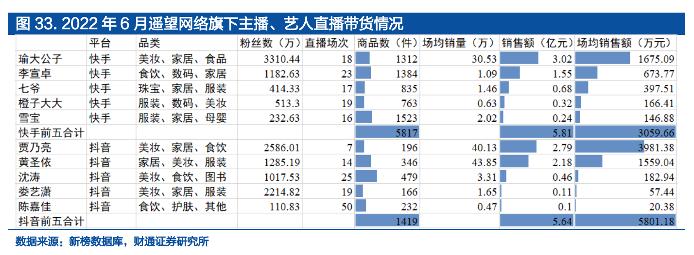 2022年6月遥望科技旗下主播、艺人直播带货情况 图片来源:财通证券研报