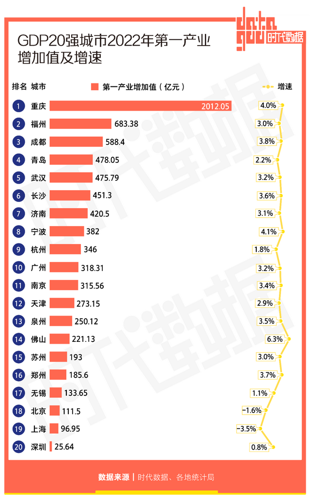 从第一产业增速来看,佛山、宁波、重庆位居前三,增速分别为6.3%、4.1%、4.0%。