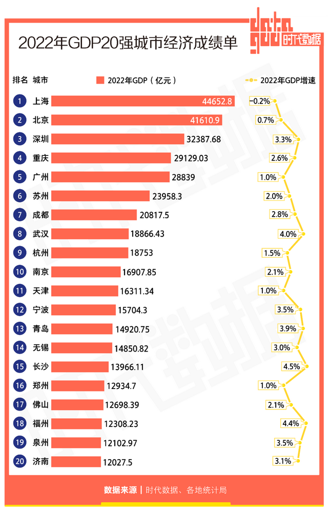2022年GDP20强城市出炉:上海稳居第一,武汉重回第八