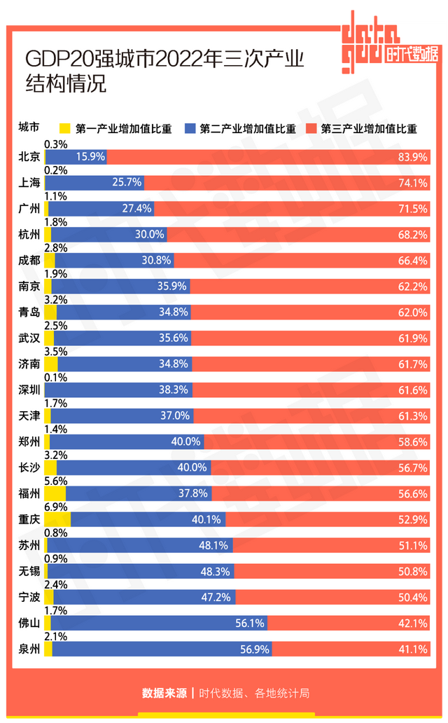 从GDP20强城市第三产业增加值比重来看,北京第三产业增加值比重最高,达到83.9%;其后,上海和广州第三产业比重超过70%,分别为74.1%、71.5%。
