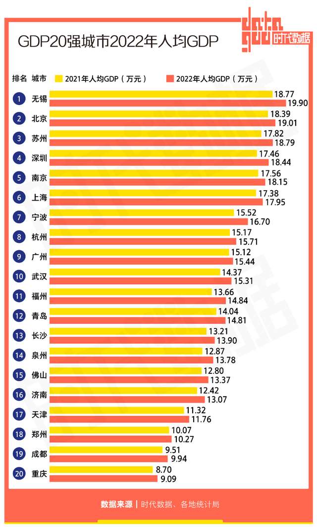 从GDP20强城市人均GDP方面来看,以第七次全国人口普查数据计算,无锡2022年人均GDP位列第一,由2021年的18.77万元增至19.90万元;北京2022年人均GDP紧随其后,以19.01万元位列第二。其后,苏州、深圳、南京2022年人均GDP均超过18万元,分别达到18.79万元、18.44万元、18.15万元。