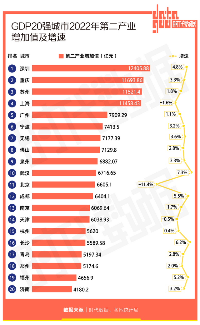 从GDP20强城市第二产业增加值来看,深圳以12405.88亿元的第二产业增加值居首,重庆、苏州、上海分别以11693.86亿元、11521.4亿元、11458.43亿元的第二产业增加值紧随其后。