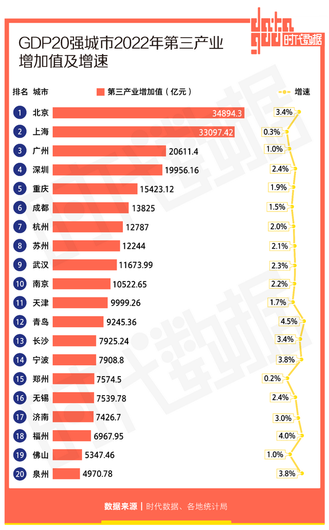 从GDP20强城市第三产业增加值来看,一线城市依然位居前四。其中,北京第三产业增加值达到34894.3亿元,位居第一;其后,上海以33097.42亿元的第三产业增加值位居第二,广州以20611.4亿元的第三产业增加值位居第三。