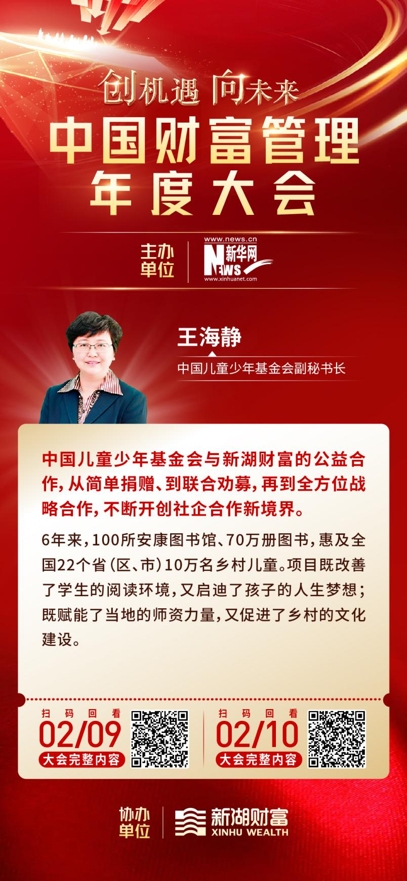 2月9日—10日,由新华网主办、新湖财富协办的中国财富管理年度大会在线上举行。中国儿童少年基金会副秘书长王海静出席大会并表示,中国儿童少年基金会是在党中央高度重视、亲切关怀下成立的新中国第一家国家级公募基金会,经过40余年积累和沉淀,形成了自己的公益慈善文化,建立了高效专业的公益慈善队伍,制定了一系列加强自身建设的规章制度。中国儿童少年基金会将始终牢记为党育人、为国育才的初心使命,与志同道合的各界爱心力量一起,促进儿童健康成长、全面发展。