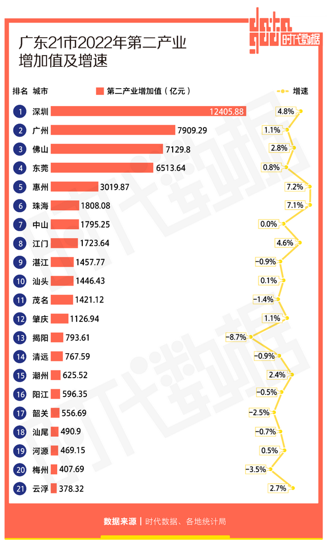 从第二产业增加值来看,深圳第二产业增加值达到12405.88亿元,领跑全省;广州、佛山分别以7909.29亿元、7129.8亿元的第二产业增加值分列二、三。