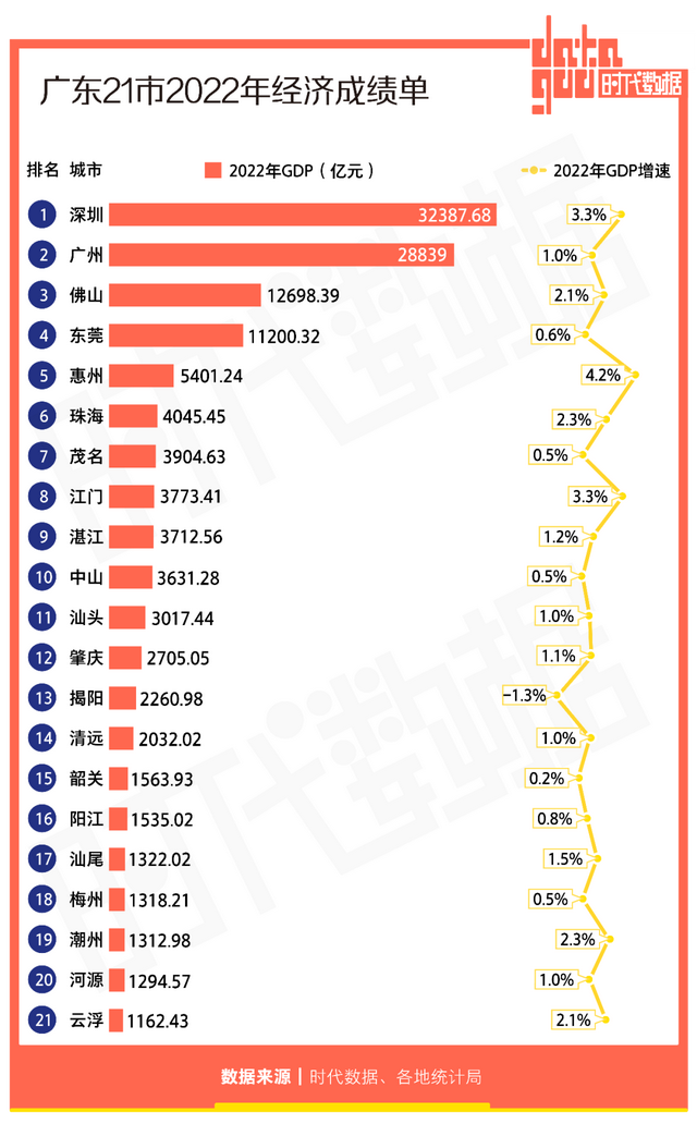 广东21市2022年经济成绩单:深圳经济总量领先,惠州经济增速领跑