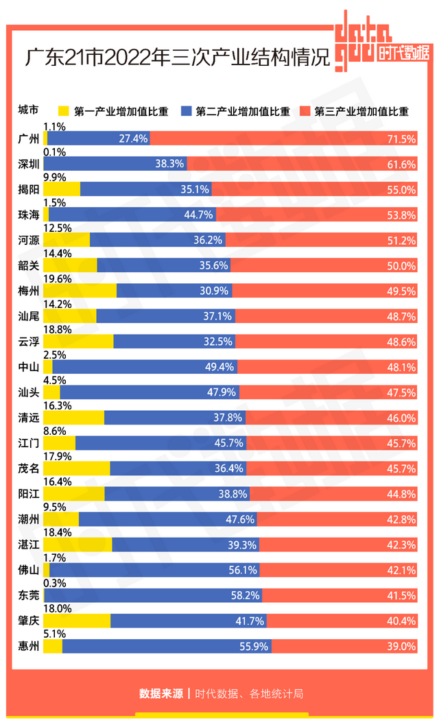 从第三产业增加值比重来看,广州第三产业增加值比重最高,达到71.5%;深圳、揭阳位居二、三,第三产业增加值比重分别为61.6%、55.0%。
