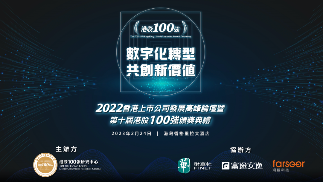 为响应时代机遇,由港股 100 强研究中心主办,财华社、富途安逸、洞视科技联合协办的“数字化转型,共创新价值”——2022香港上市公司发展高峰论坛暨第十届“港股100强”颁奖盛典,将于2023年2月24日(星期五)下午在港岛香格里拉大酒店隆重举行。活动将围绕数字经济时代下的企业转型新机遇,探讨企业如何通过数字化工具,重塑自身价值,获得突破与新增长。特邀嘉宾及企业领袖将分享区块链、大数据、人工智能等技术的前沿进展及应用场景,企业从WEB2.0向WEB3.0转型的实践经验,以及通过数字化工具服务上市公司客户的优秀案例。