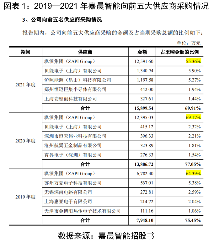 飒派集团作为全球电机控制器领域的龙头企业,向嘉晨智能销售电机控制器、接触器、电机等原材料,是其第一大供应商。2019—2021年,嘉晨智能向飒派集团采购金额比例皆超50%。