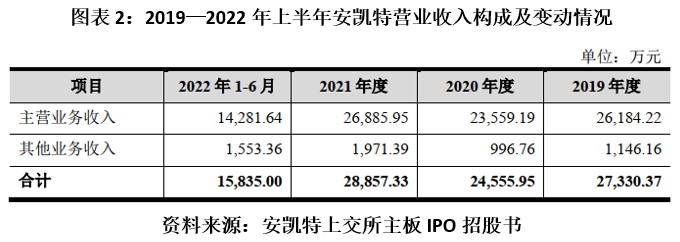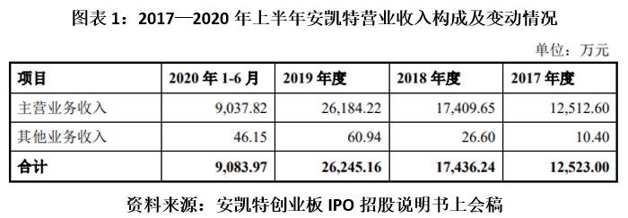 2020年11月12日,安凯特在深交所创业板IPO上会前披露招股说明书(上会稿)。根据该招股说明书,2017—2020年上半年,该公司的其他业务收入分别为10.4万元、26.6万元、60.94万元、46.15万元,主要为少量废品的销售收入等。