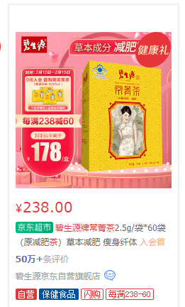 碧生源牌常菁茶由于其宣称的减肥功能,因而受到许多女性消费者的追捧,在某平台上,其评价数量高达50万条以上,但是售价也高达238元/盒(60袋)。