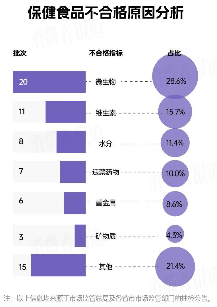 抽检结果显示,监管部门抽检中发现不合格保健食品共计70批次,不合格指标主要涉及微生物、维生素、水分、违禁药物、重金属、矿物质等,其中,微生物不合格次数较多,占比达到28.6%,其次是维生素和水分;值得注意的是,有7批次保健食品发现添加了违禁药物。
