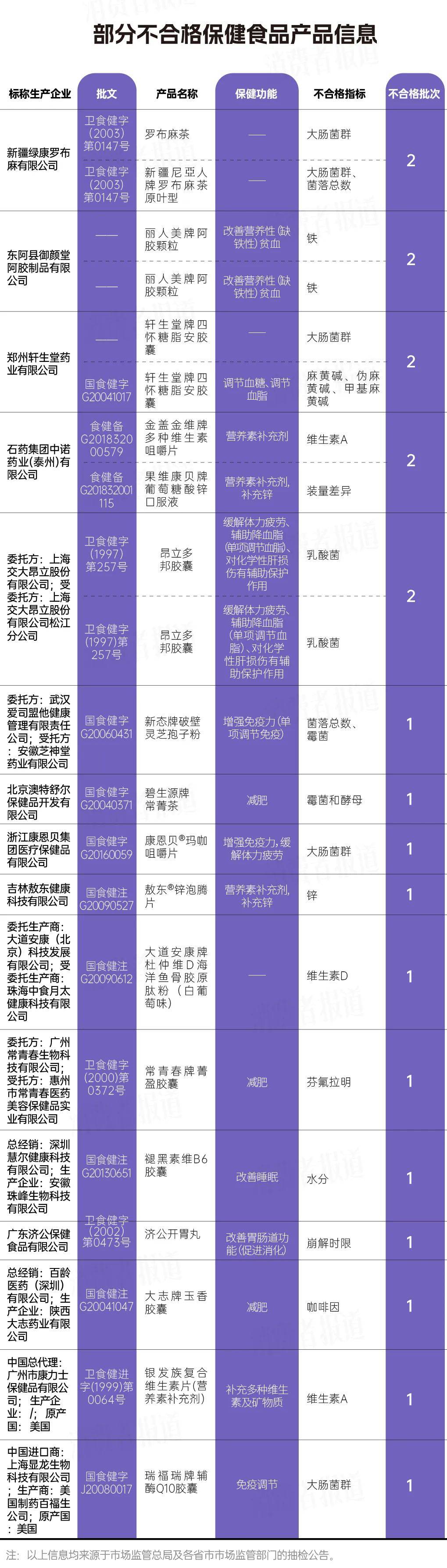 抽检结果发现,标称新疆绿康罗布麻有限公司、东阿县御颜堂阿胶制品有限公司、郑州轩生堂药业有限公司、石药集团中诺药业(泰州)有限公司等企业生产的保健食品均有2批次不合格,属于不合格次数较多的情况。