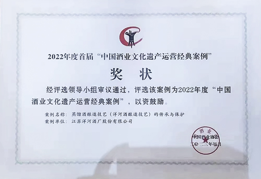 洋河股份“蒸馏酒酿造技艺(洋河酒酿造技艺)的传承与保护”,荣获“中国酒业文化遗产运营经典案例”;