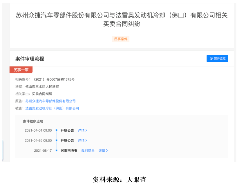 然而,根据天眼查,案件号为(2021)粤0607民初1375号的文件显示,2021年,众捷汽车与法雷奥子公司法雷奥发动机冷却(佛山)有限公司(下称“法雷奥佛山”)存在合同纠纷。