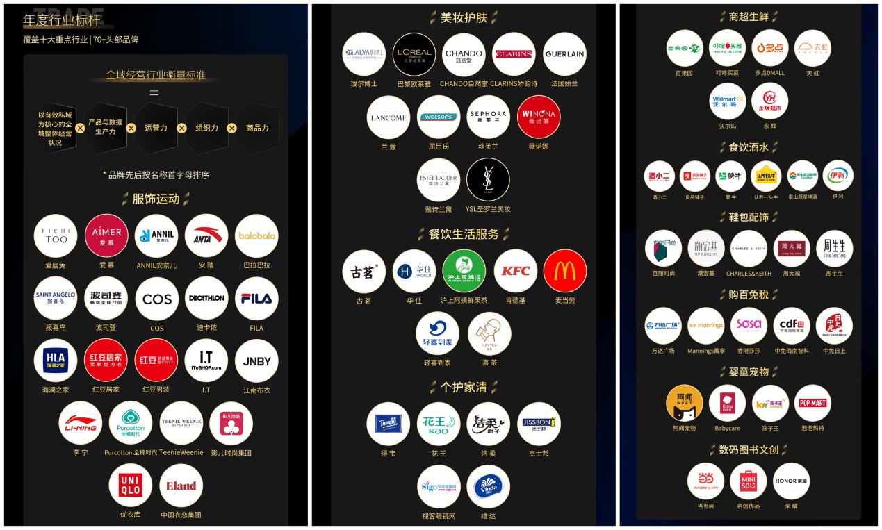 今年,榜单亦迎来了入围品牌和上榜品牌的双重提升,上榜企业包罗了服饰运动、美妆护肤、商超生鲜、餐饮连锁、婴童玩具等十大重点行业,参与评选商家数量超过500家,新上榜品牌达50余个。这说明越来越多的企业在进行持续性的私域投入和建设,在全域经营上的潜力和成果正逐步显现。