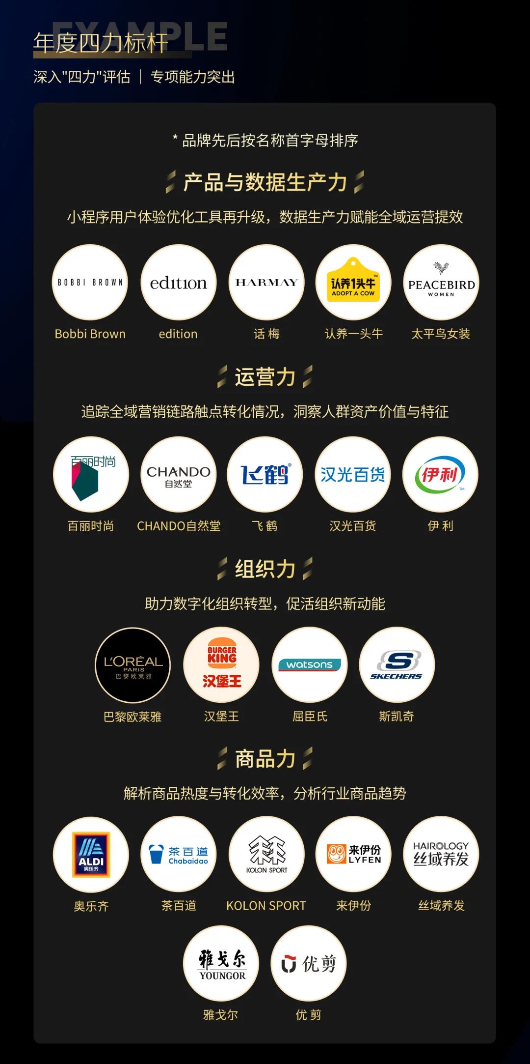 年度行业标杆以入围品牌2022全新升级四力增长平台商家评级结果作为核心评审依据,以有效私域为核心的全域整体经营状况、产品与数据生产力、运营力、组织力、商品力为核心维度综合计算;年度四力标杆则深入“四力”评估,嘉奖专项能力突出的品牌。