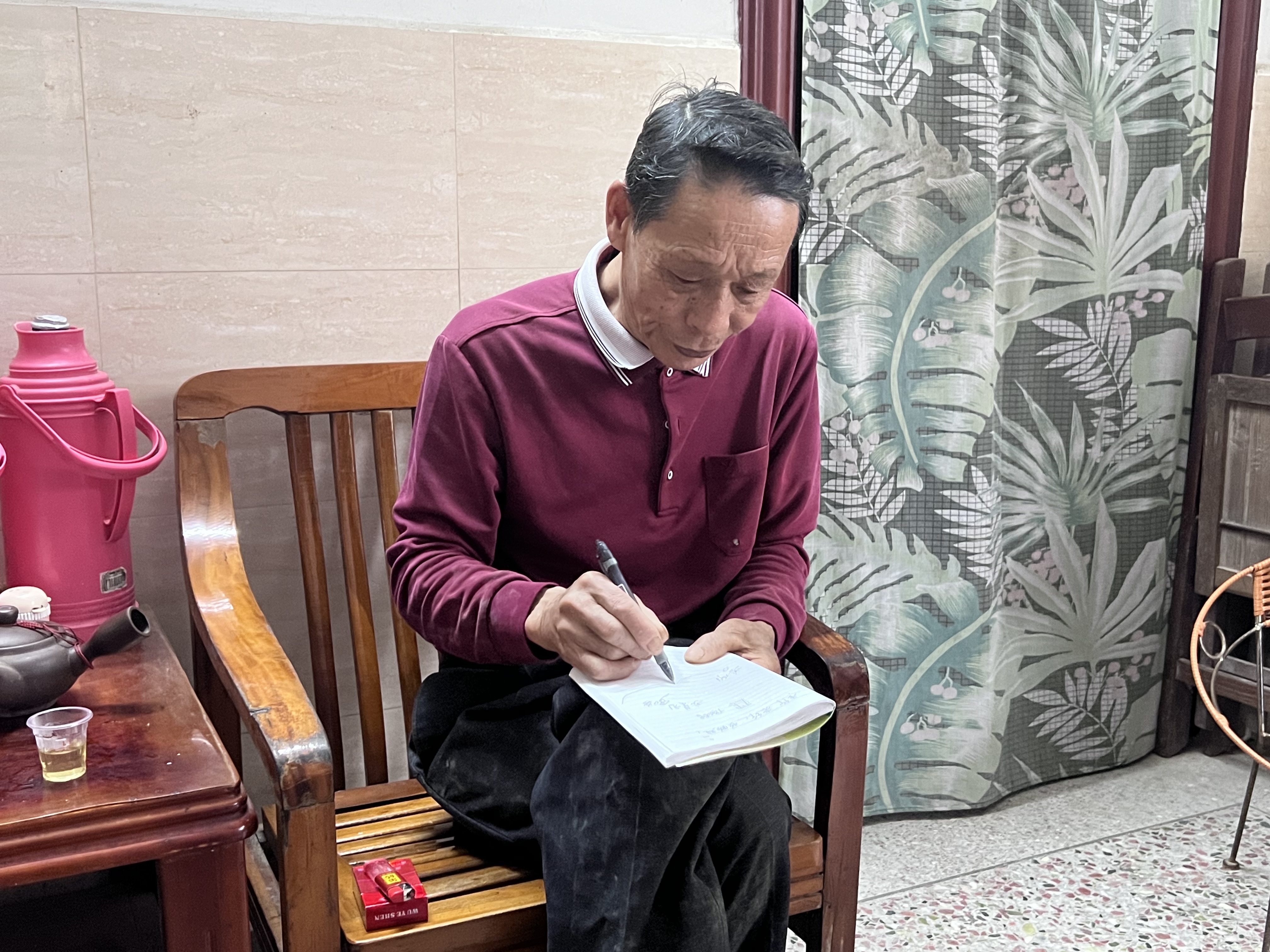 赖升平在纸上画扎排的示意图 时代周报 李杭/摄