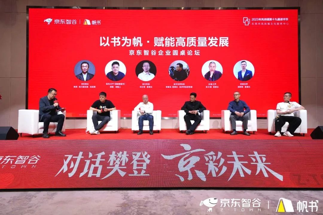 活动现场,知识赋能不断“加菜”。由樊登,京东智谷园区企业代表深川科技董事长羊红军,金天光学科技董事长、经济学投资专家李新光,云雀之声董事长张卫满,优美世界董事长、原创汉美学品牌“纷丽”领军人郭同军,京东智谷执行副总裁、项目总经理陈昱,共同为现场观众带来 “以书为帆·赋能高质量发展——京东智谷企业圆桌论坛”。