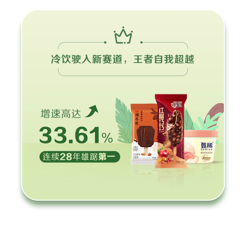 同时,公司成功抓住冷饮产品属性从防暑降温转向休闲食品的市场机遇,推动冷饮业务进入更具潜力和成长空间的新赛道。报告期,公司冷饮业务营业收入95.67亿元,同比大幅增长30%以上,增速和市场份额保持行业第一,连续28年稳居全国冷饮行业龙头地位。其中,明星品牌巧乐兹、甄稀、须尽欢更是增长强劲。