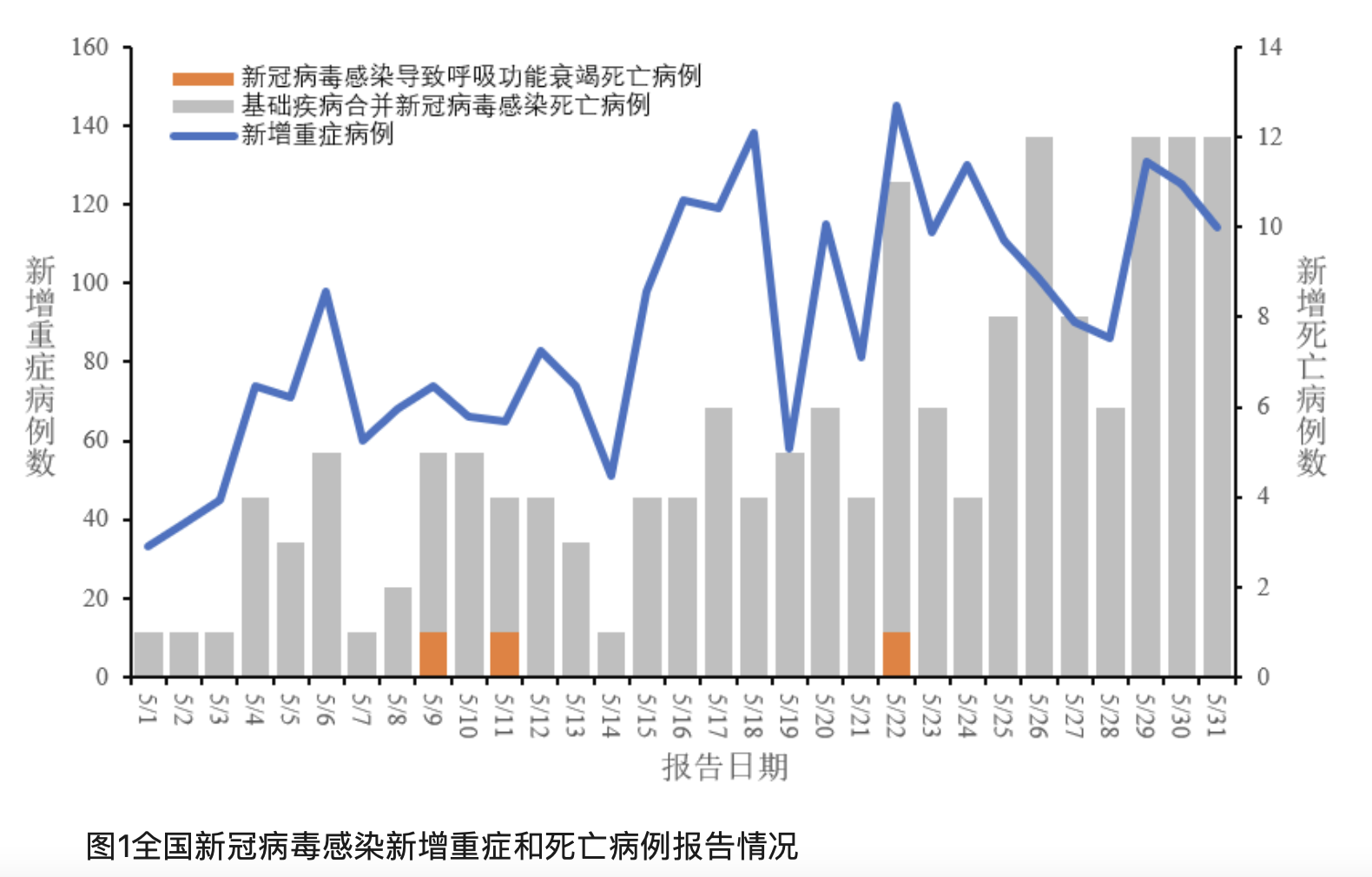 在致重症和死亡病例方面,上述报告显示,2023年5月1日-5月31日,全国31个省(自治区、直辖市)及新疆生产建设兵团报告新增重症病例2777例、死亡病例164例,其中新冠病毒感染导致呼吸功能衰竭死亡病例3例、基础疾病合并新冠病毒感染死亡病例161例。
