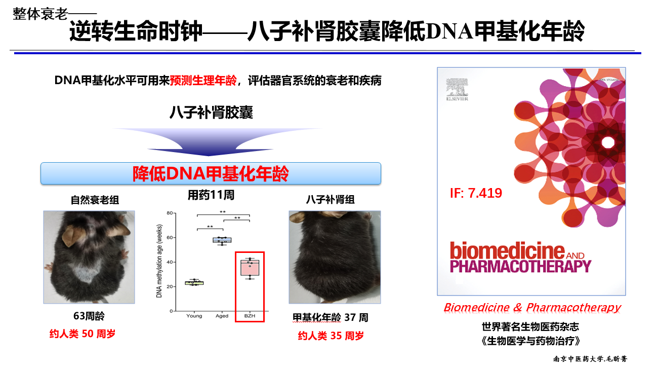 甲基化年龄是世界上被用来预测生理年龄,评价器官系统的衰老和疾病的一种公认的方法。近日,《八子补肾延缓自然衰老小鼠表观遗传衰老并延长其健康寿命》的研究论文发表在国际药学领域SCI期刊《生物医学与药物治疗》。该论文中,研究人员首次揭示了中药八子补肾胶囊通过逆转DNA甲基化衰老而延缓整体衰老的作用机制,提示了该药在延长健康寿命临床应用中的巨大潜力。研究显示,八子补肾胶囊可改善自然衰老小鼠的记忆力和肌肉耐力,逆转自然衰老小鼠增龄性的甲基化变化,显著降低其DNA甲基化年龄并延长其健康寿命。衰老小鼠服用该药11周,有效逆转了DNA甲基化年龄21周,约相当于人类年轻了15岁。