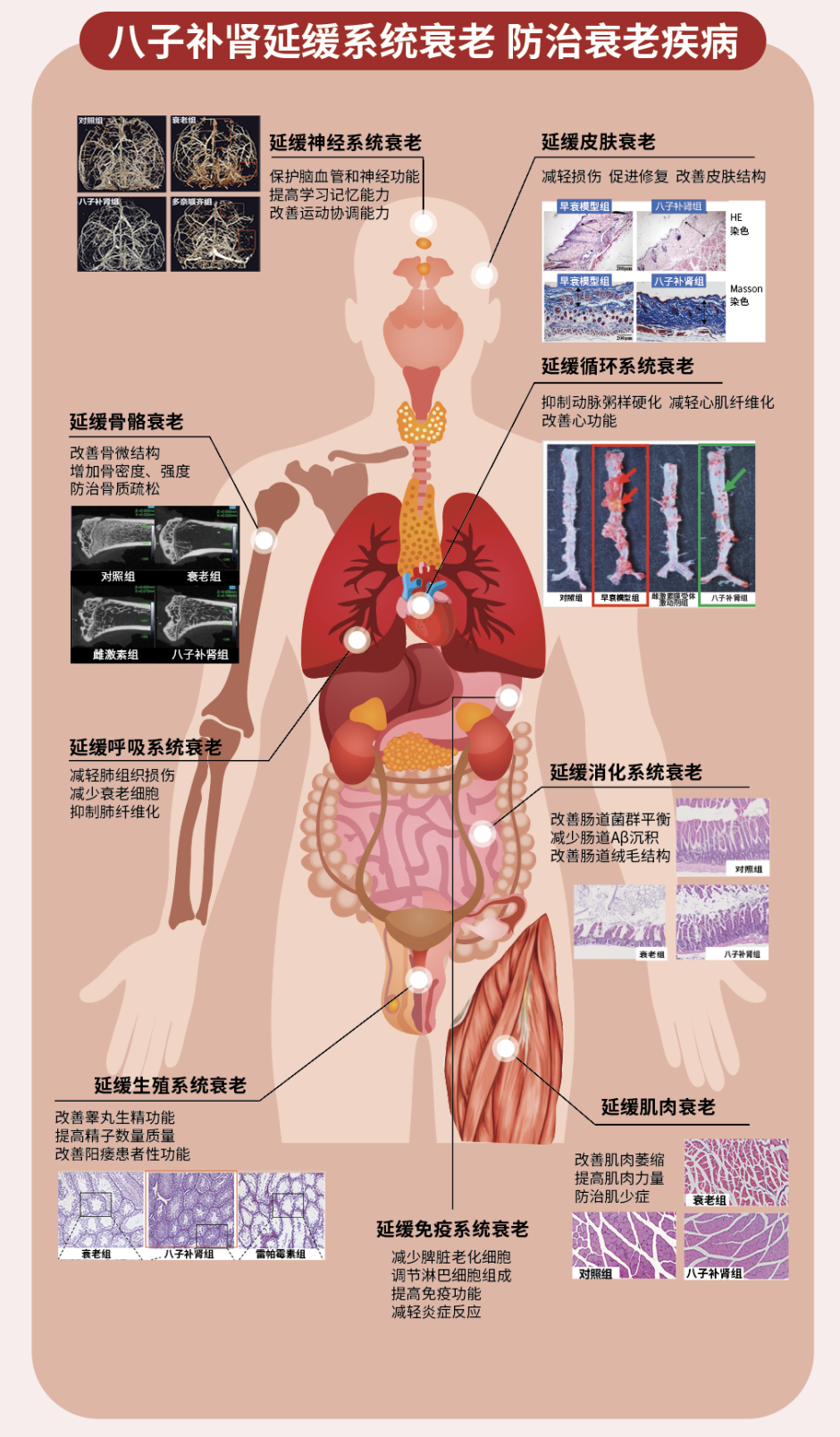 相关研究还显示,除了延缓整体衰老外,八子补肾胶囊对神经、皮肤、骨骼、肌肉、循环、呼吸、消化、免疫、生殖等多个系统的功能减退具有系统干预和综合抗衰老的作用。