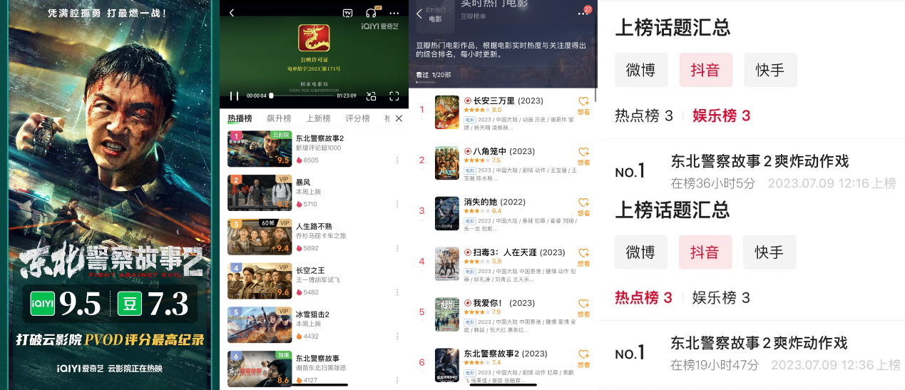 此外,《东北警察故事2》也凭借爱奇艺评分9.5、豆瓣开分7.3,创造了爱奇艺云影院首映PVOD发行影片的评分新高点。上映以来,该片全网热度持续走高,登上豆瓣实时热门电影榜单TOP6,抖音热点榜TOP12、娱乐榜TOP5;持续霸榜爱奇艺站内电影热播榜首位,实现口碑票房双丰收,并带动前作《东北警察故事》热度上升,登上电影热播榜第6位、飙升榜第3位。