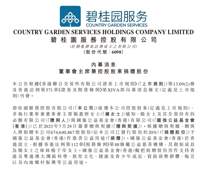 碧桂园服务公告显示,杨惠妍将向国强公益基金会(香港)有限公司捐赠碧桂园服务674640867股股份作慈善公益用途,捐赠股份占碧桂园服务已发行股份约20%,捐赠完成后,杨惠妍将(直接和间接)拥有公司543695233股股份,占已发行股份约16.12%。