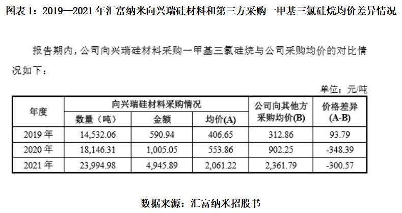 结合汇富纳米净利润从2019年、2020年均不足300万元飙升至2021年的6000万元,以及2021年其向兴瑞硅材料采购的价格跟向其他第三方采购的价格差异比例最高接近-40%的情况来看,汇富纳米盈利水平大增或与其向兴瑞硅材料低价采购原材料有关。