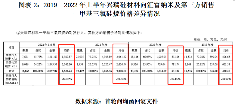 另外,据首轮问询函回复文件,2019—2022年上半年,兴瑞硅材料向汇富纳米销售一甲基三氯硅烷的价格与同期向第三方的销售价格(不含运费)差异比例分别为-38.72%、-29.15%、-21.52%、-22.25%,兴瑞硅材料向汇富纳米销售一甲基三氯硅烷的价格明显低于第三方。
