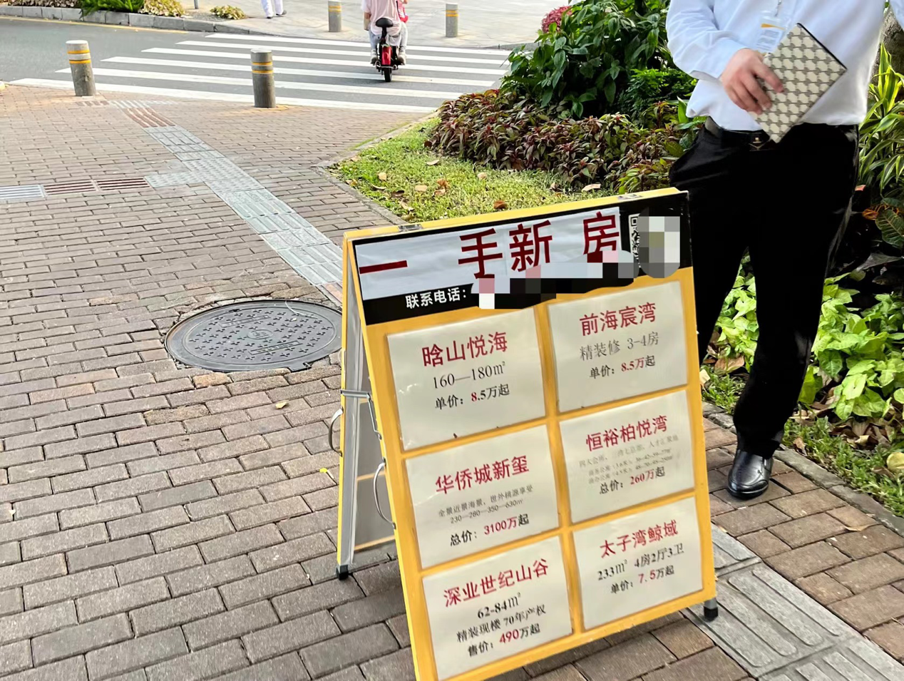 一名深圳经纪人在街头推销楼盘,时代周报记者摄于今年7月