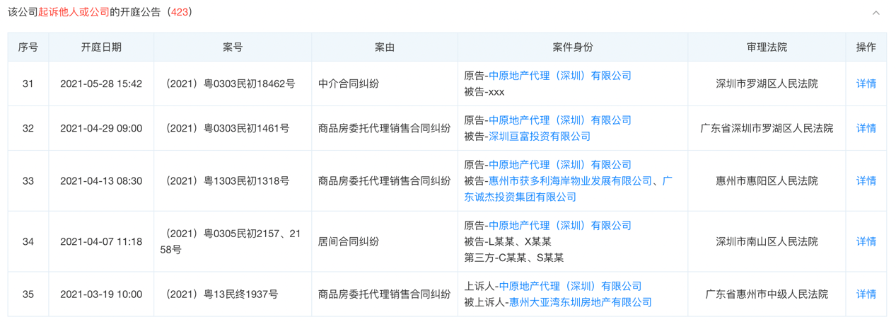 此外,时代周报记者统计天眼查披露信息发现,2020年至今,中原地产代理(深圳)有限公司(深圳中原的运营主体)为原告、案由为“商品房委托代理销售合同纠纷”的开庭公告有22份,涉及恒大地产、远洋控股、龙光集团、泰禾集团、富悦房地产、祥祺房地产、大亚湾东圳房地产等房企。