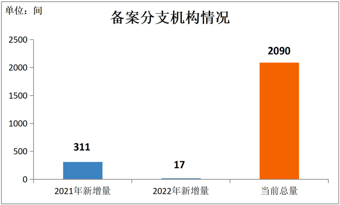《2022年度深圳市房地产中介行业白皮书》指出,受2022年低迷市场行情影响,中介机构经营压力大,通过合并或裁撤不断优化从业主体结构。截至2022年年底,深圳有效备案地铺(在主管部门进行备案的地铺)为2090间,较2021年减少1035间。其中,2022年仅新增17间备案地铺, 同比大跌94.5%。