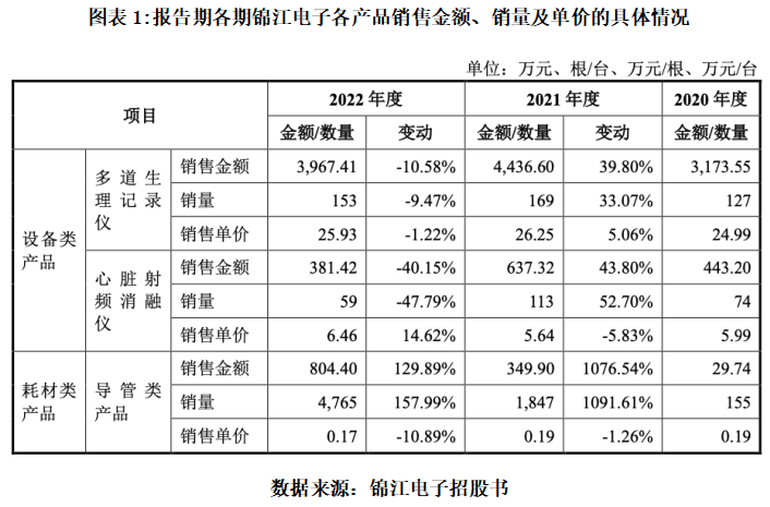 然而,锦江电子设备类产品盈利能力并不出众,销量较低,销售金额有限。报告期各期,锦江电子多道生理记录仪的销量分别为127台、169台、153台,心脏射频消融仪的销量分别为74台、113台、59台。不难发现,2022年度,这两款产品的销量同时下滑,其中多道生理记录仪销量同比下滑9.47%,心脏射频消融仪销量同比下滑47.79%,近乎腰斩,这或许是该公司2022年营业收入同比下滑的部分原因。