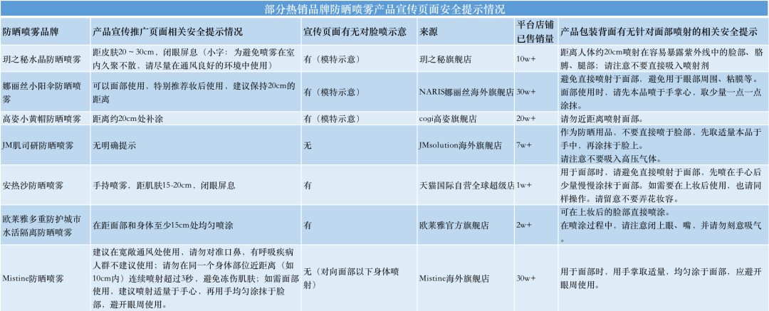 具体到产品宣传页面的使用文字提示来看,除Mistine防晒喷雾提示“请勿对准口鼻”,其余品牌均提示保持对面部15~20cm左右的距离喷涂。根据Mistine防晒喷雾的使用提示,在同一身体部位近距离(如10cm内)连续喷射超过3秒有冻伤风险。