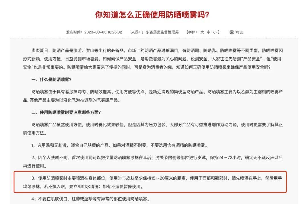 事实上,广东省药品监督管理局在8月3日就发文称,使用防晒喷雾时主要喷洒在身体部位,使用时与皮肤至少保持15~20厘米的距离。使用于面部和颈部时,请先喷洒在手上,然后用手均匀涂抹。若不慎入眼,要立即用水清洗;如有不适要暂停使用。