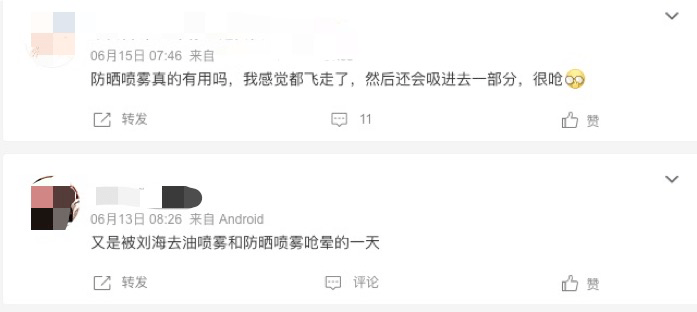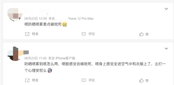 参照防晒喷雾产品宣传过程中的缺乏规范的使用示意,不少消费者在社交平台反映在使用过程中出现了负面的使用感受。