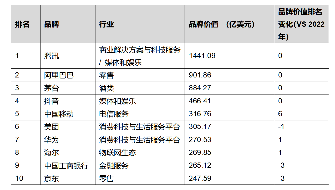 (图源:2023年凯度BrandZ最具价值中国品牌10强榜单)