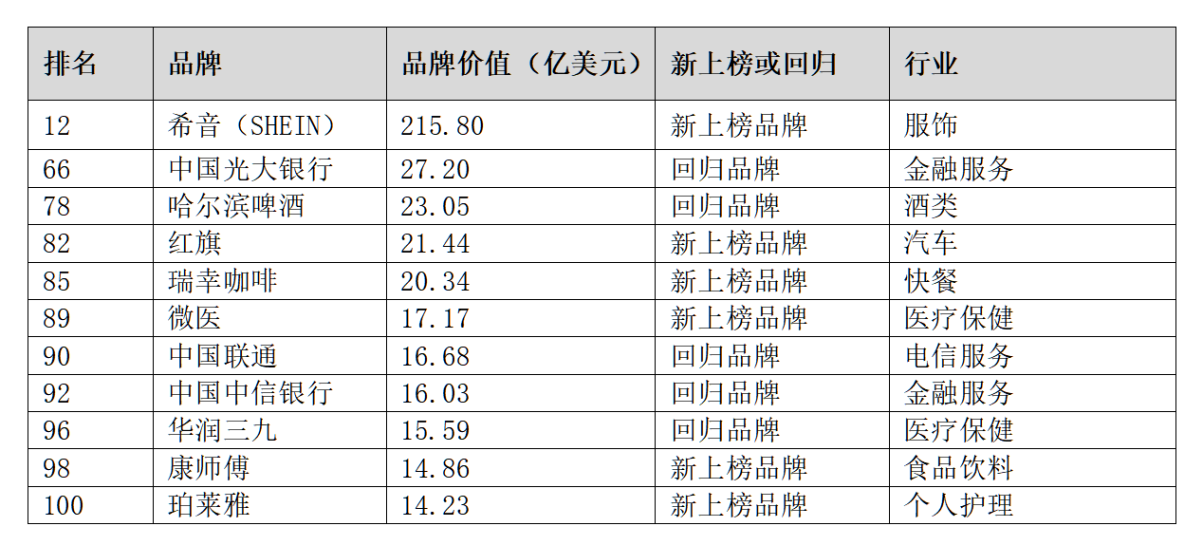 今年,凯度BrandZ中国百强榜单迎来了11新上榜或回归品牌。这些品牌来自九个不同行业,足以证明“英雄莫问出处”。在今天的中国市场中,打造知名品牌仍然有许多途径可供选择。全球时尚品牌希音(SHEIN)品牌价值达215.8亿美元,位列第12名,是新跃升榜单中排名最靠前的品牌。