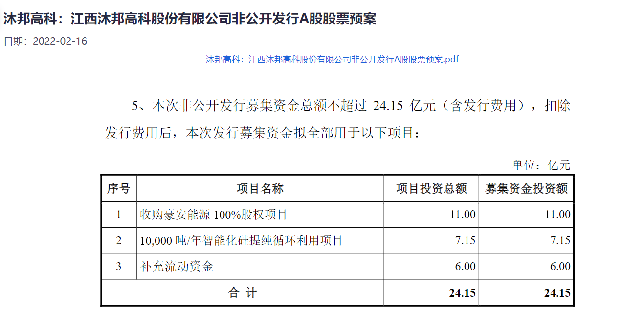 9月14日,沐邦高科(603398.SH)再次更新定增公告。公告显示,沐邦高科计划定增不超17.06亿元,分别投向去年收购的豪安能源、1万吨/年智能化硅提纯循环利用项目和补充流动资金。