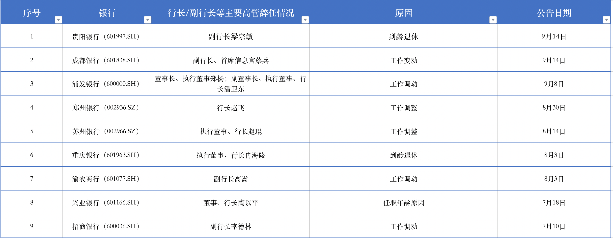其中,招商银行在7月7日宣布副行长王小青任职资格获批后,7月10日公告了另一名副行长李德林因工作调动原因辞任。