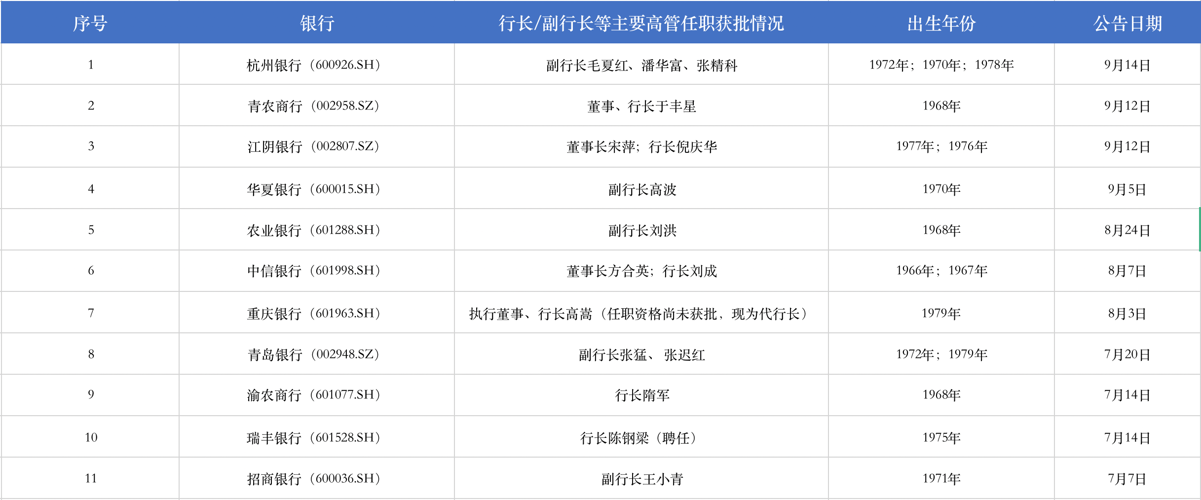 今年7月份以来A股上市银行行长/副行长等主要高管任职获批情况。资料来源:公告,时代财经/制表。