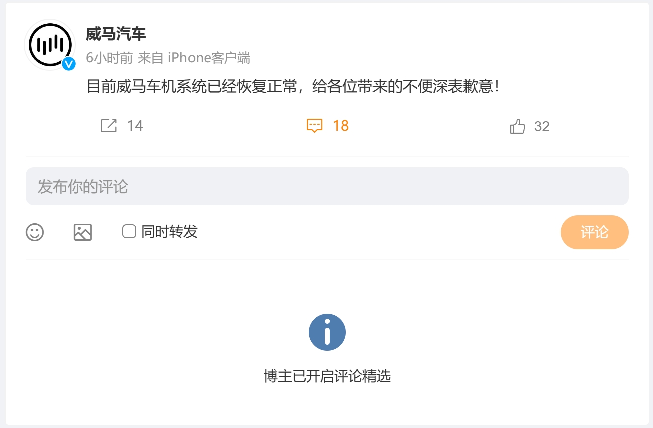 10月13日威马称车机系统已恢复,但关闭了评论区。