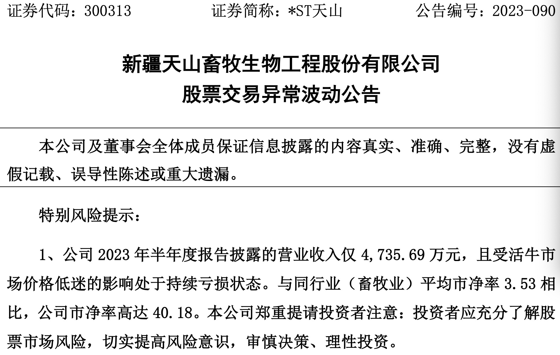*ST天山位于新疆昌吉,始建于2003年,注册资金3.12亿元,于2012年4月25日在深圳证券交易所创业板上市,是国内首家动物育种上市公司,也是目前国内唯一一家专注于肉牛产业的A股上市公司。