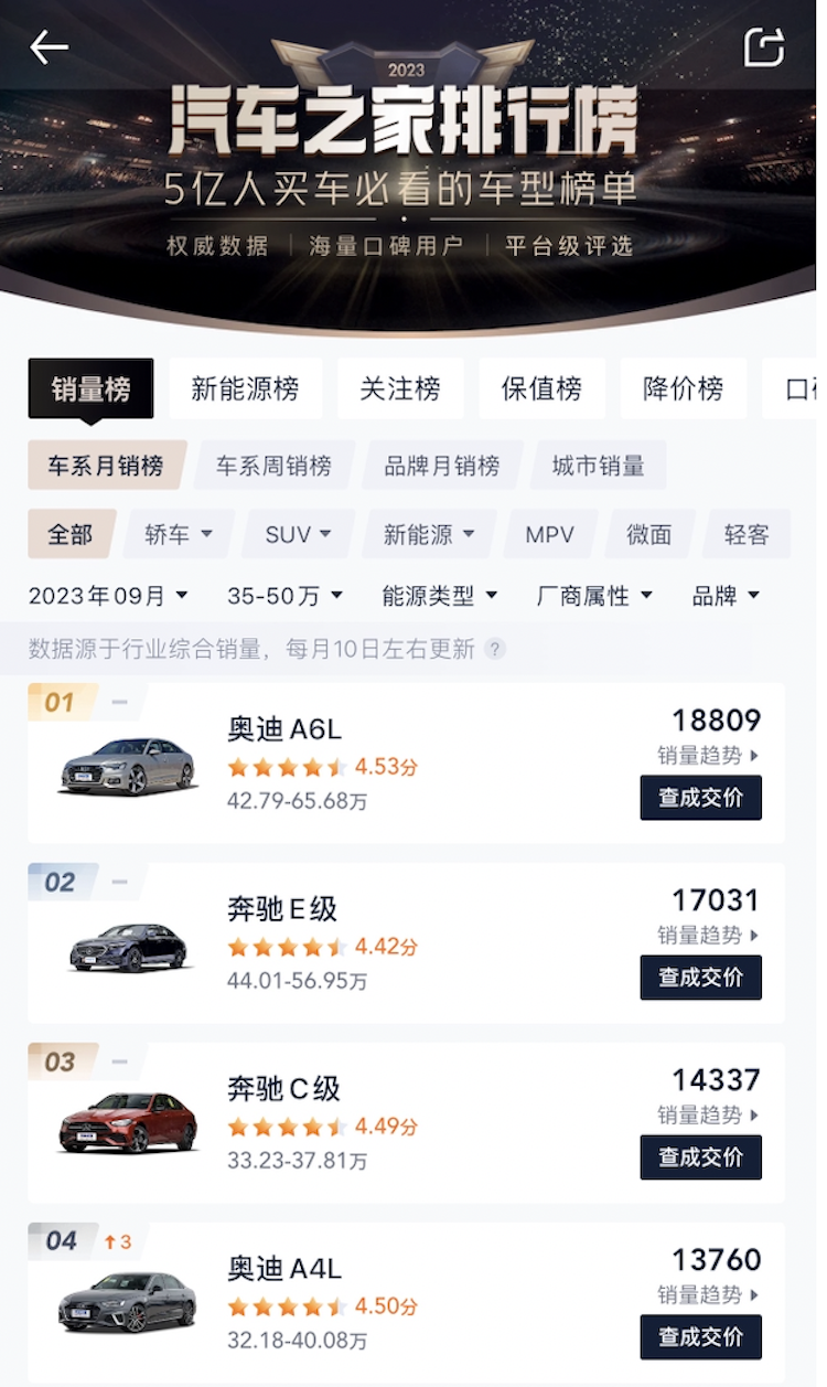 在业界看来,这一价格区间里,其不仅直面BBA等传统豪强,也面对一众实力强劲的新能源车企。据汽车之家发布的车型销量榜显示,今年9月,在25万-35万元价格区间里,Model Y遥遥领先,销量约为4.15万辆;超30万元起售的理想L7、L8,其月销量也均突破万辆。在35万-50万元区间里,奥迪A6L、奔驰E级、奔驰C级跻身车型销量榜前三,销量分别约为1.88万、1.7万、1.43万辆。