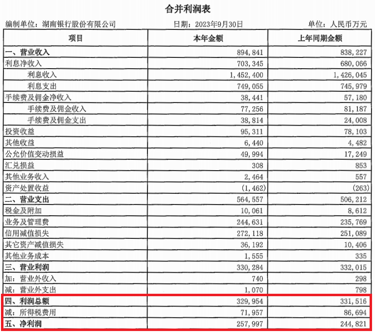 不仅如此,湖南银行2023年三季报利润总额同比下降0.47%,而净利润同比增长5.38%,主要原因是所得税费用低于去年前三季度的数据。